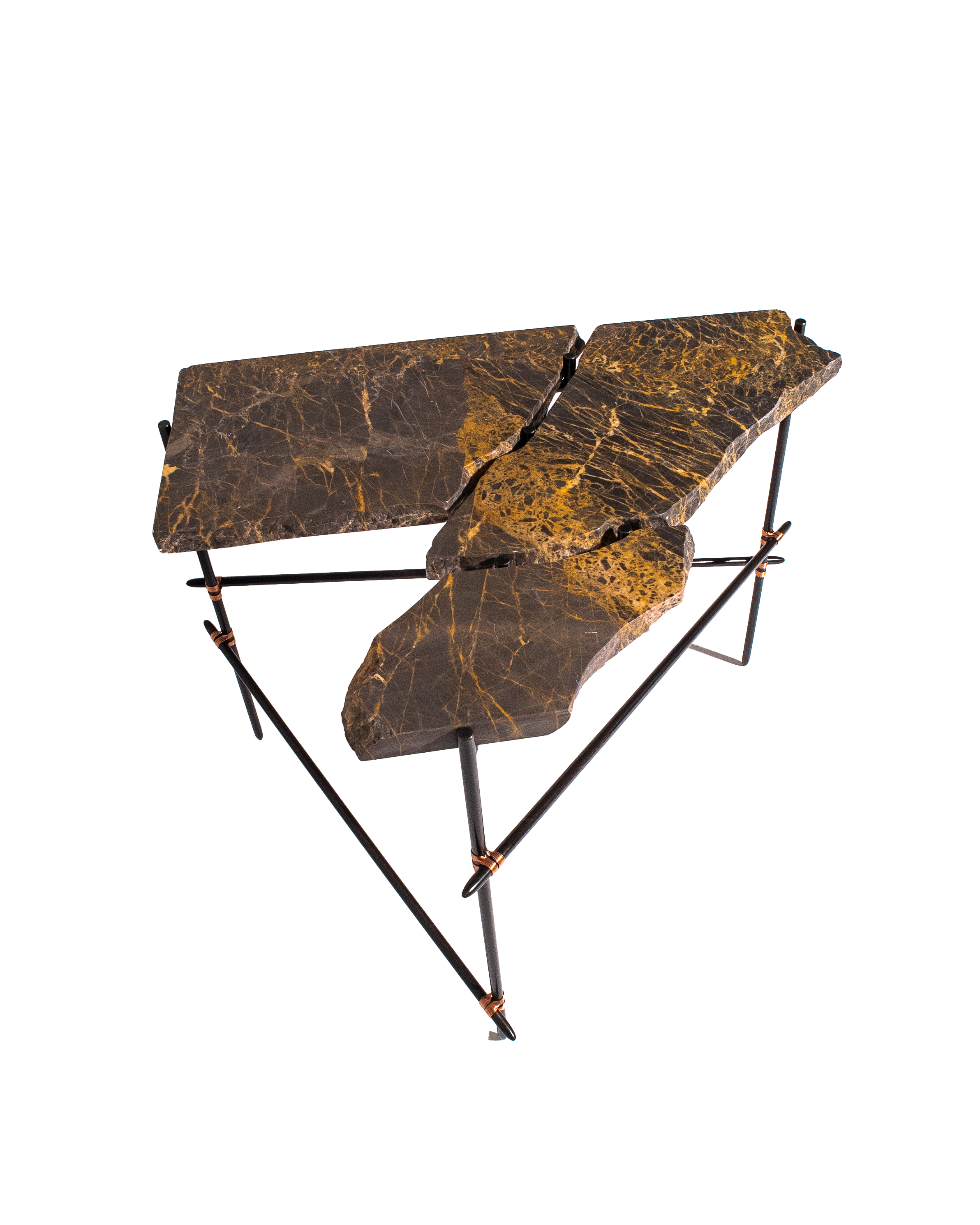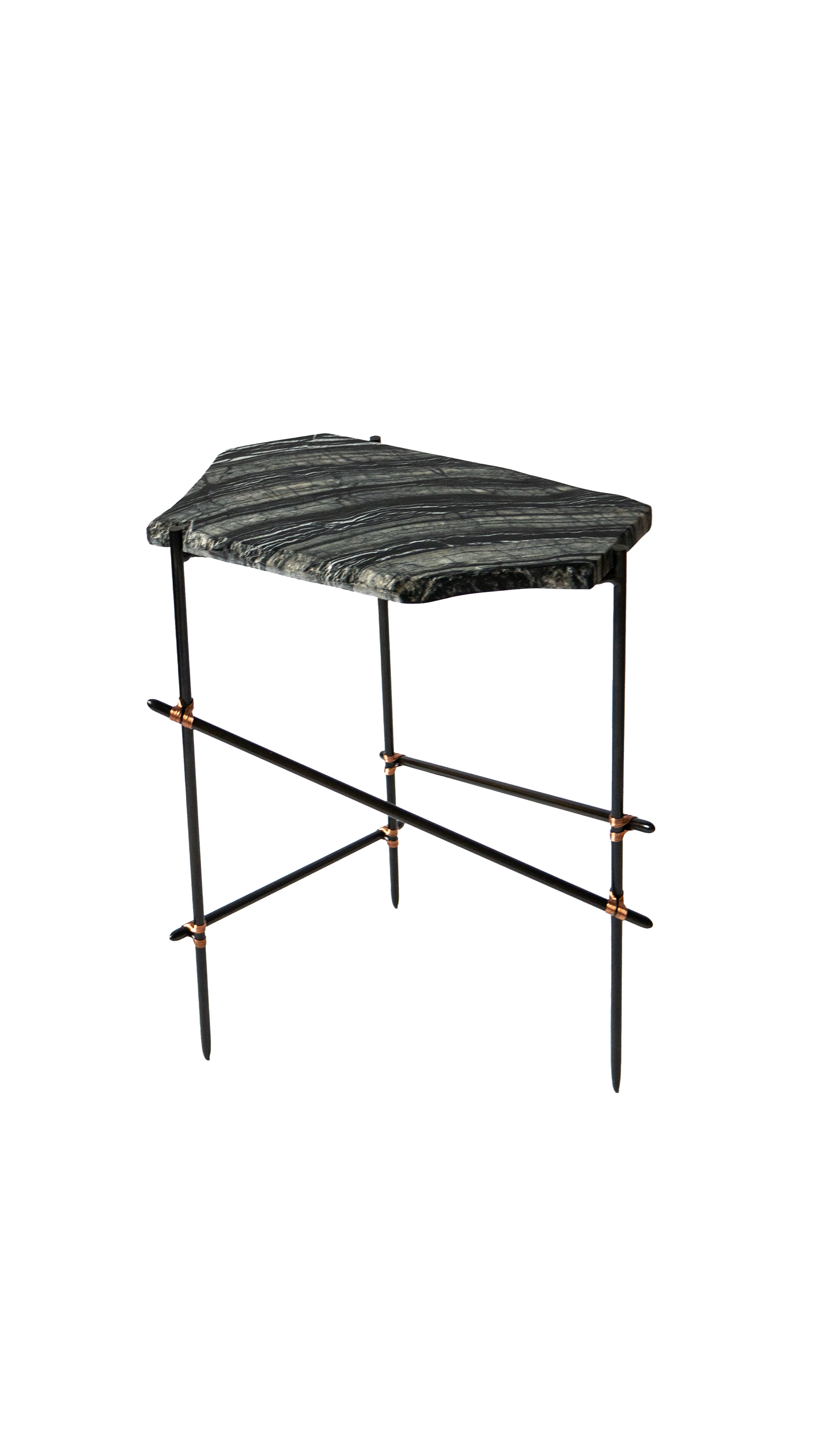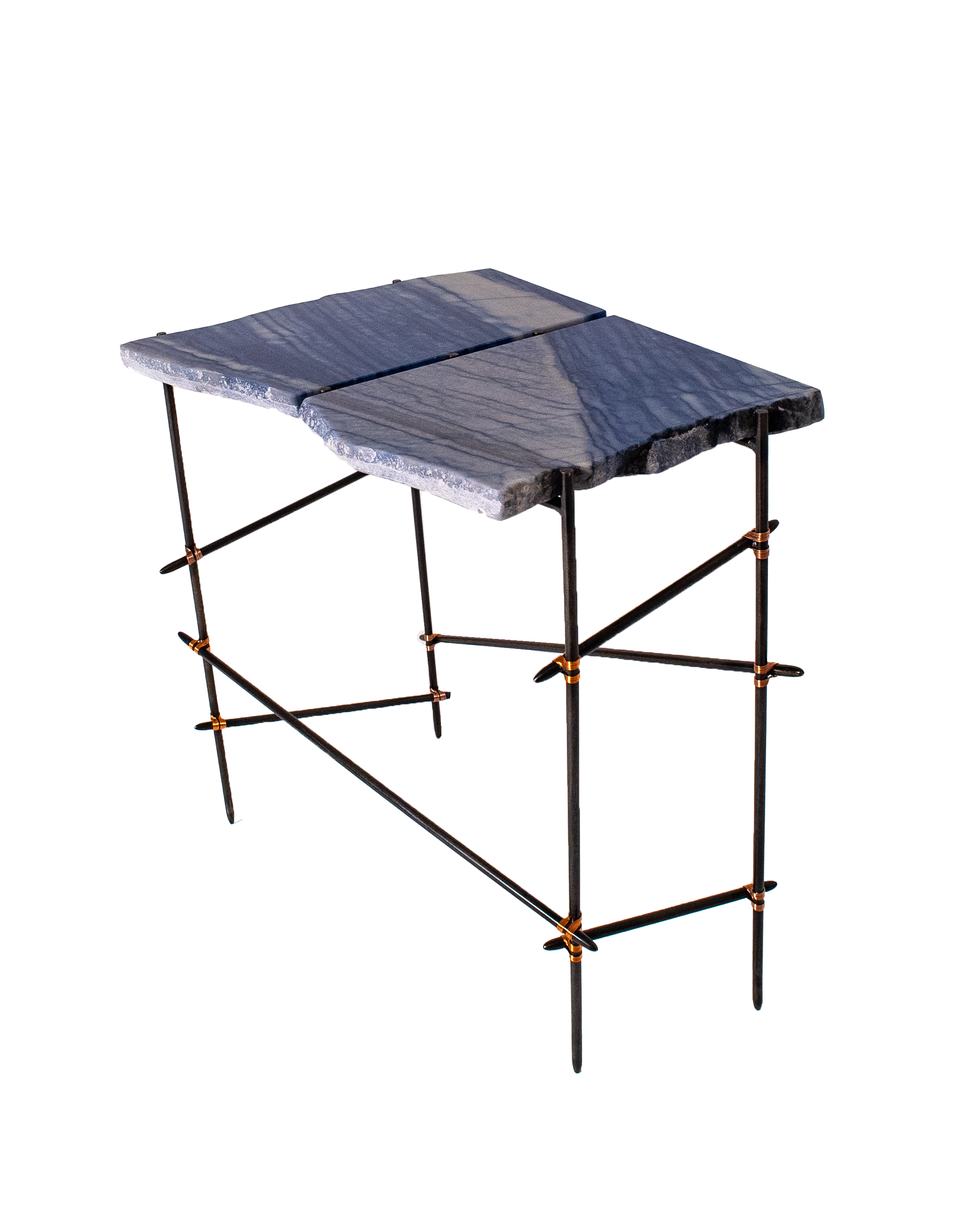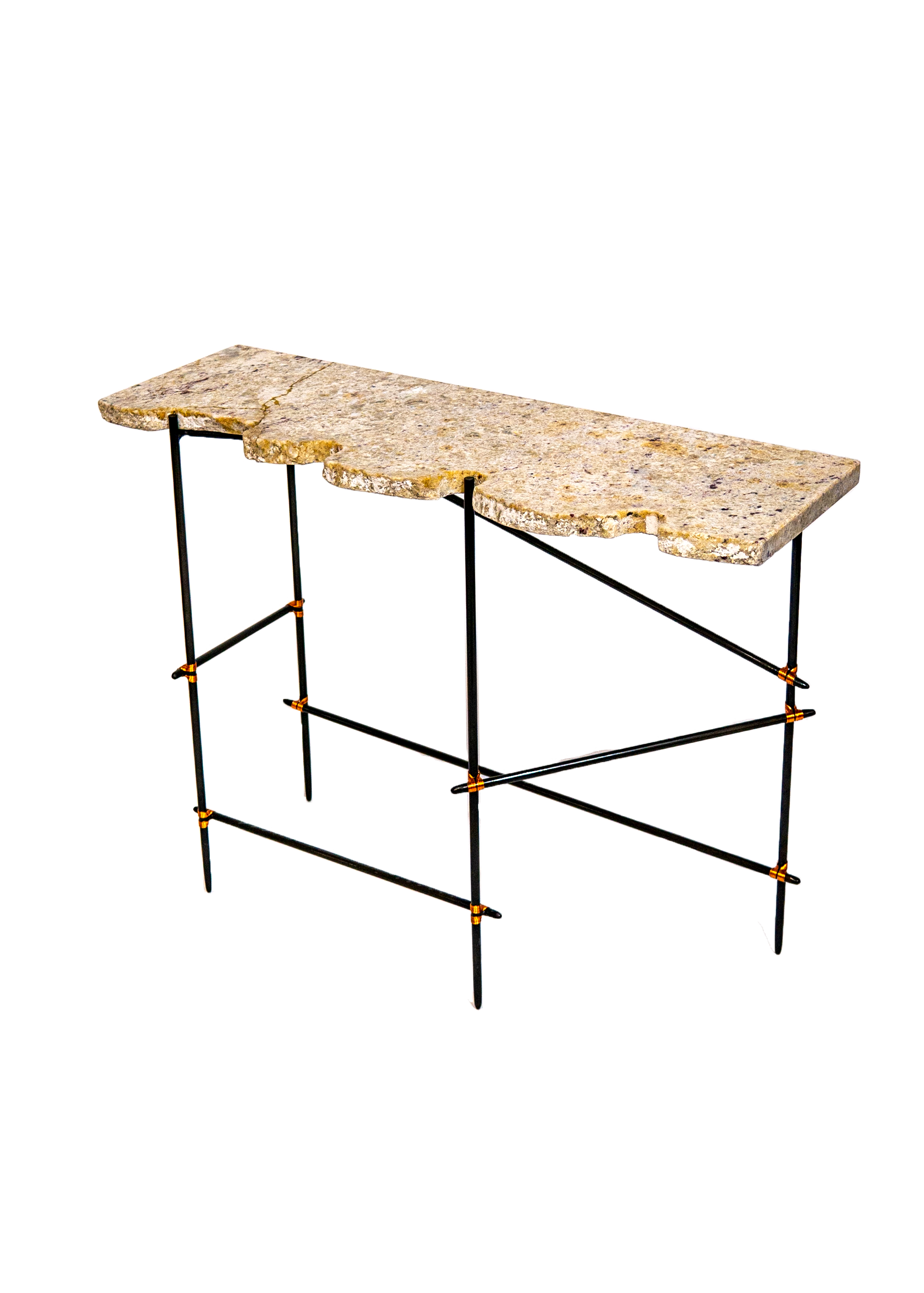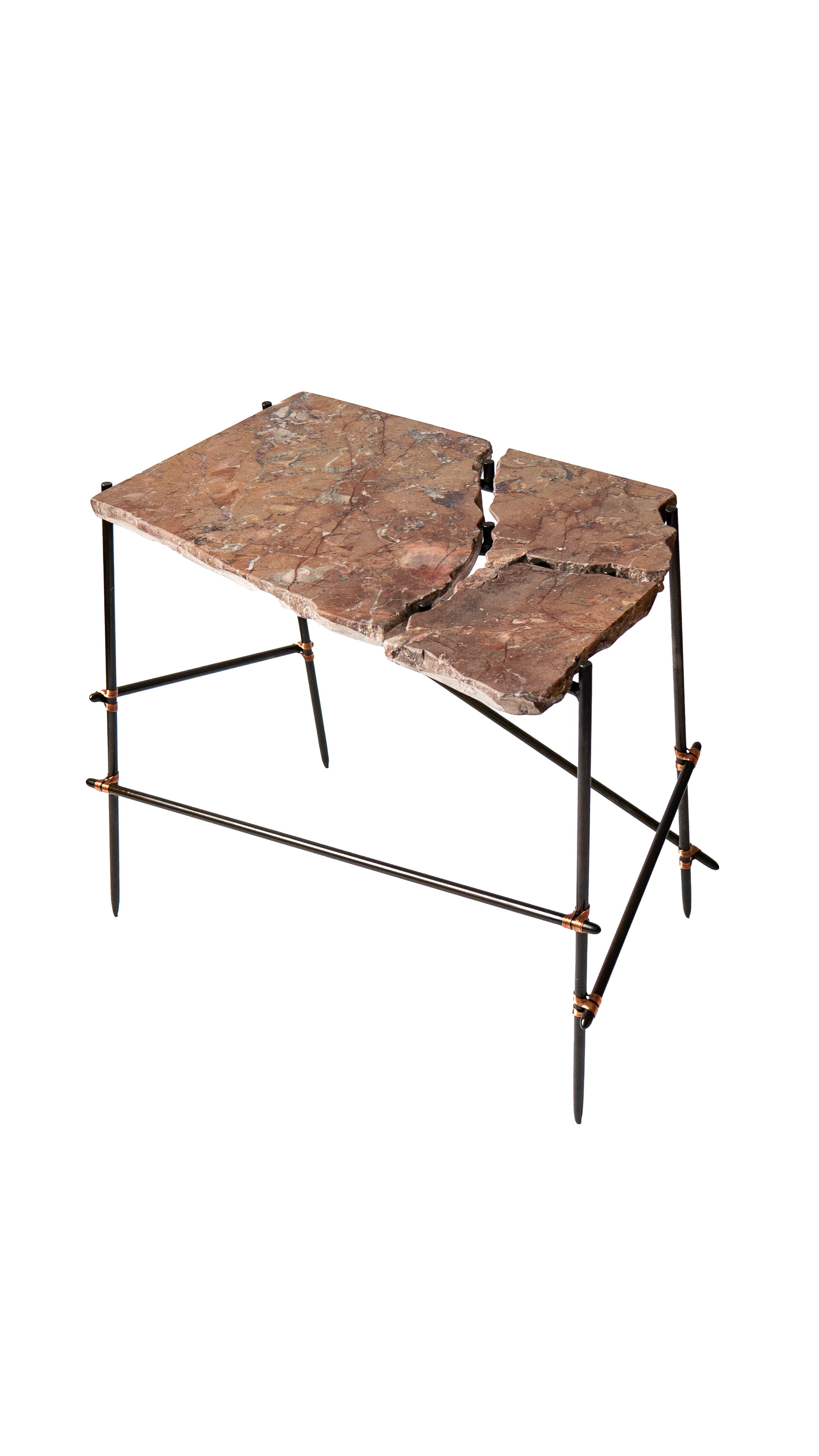 Each salvaged stone is paired with a hand-crafted steel frame specifically designed in response to its form — a quiet act of restoration. Stone surfaces are re-finished, while frames, reminiscent of ad-hoc scaffolding, are patinated, sealed, and bound with copper wire detailing, allowing imperfection to remain visible and repair to take centre stage.