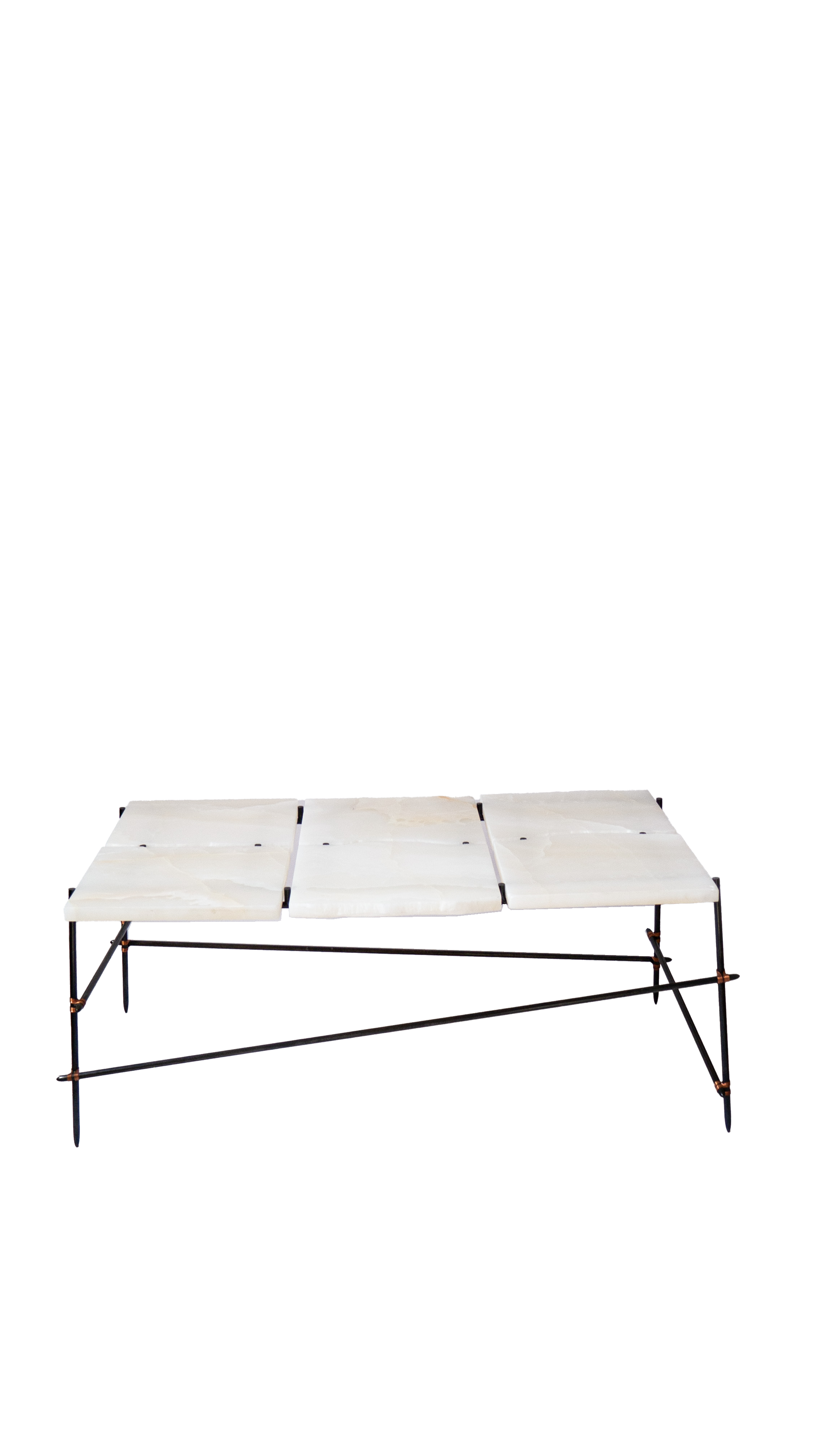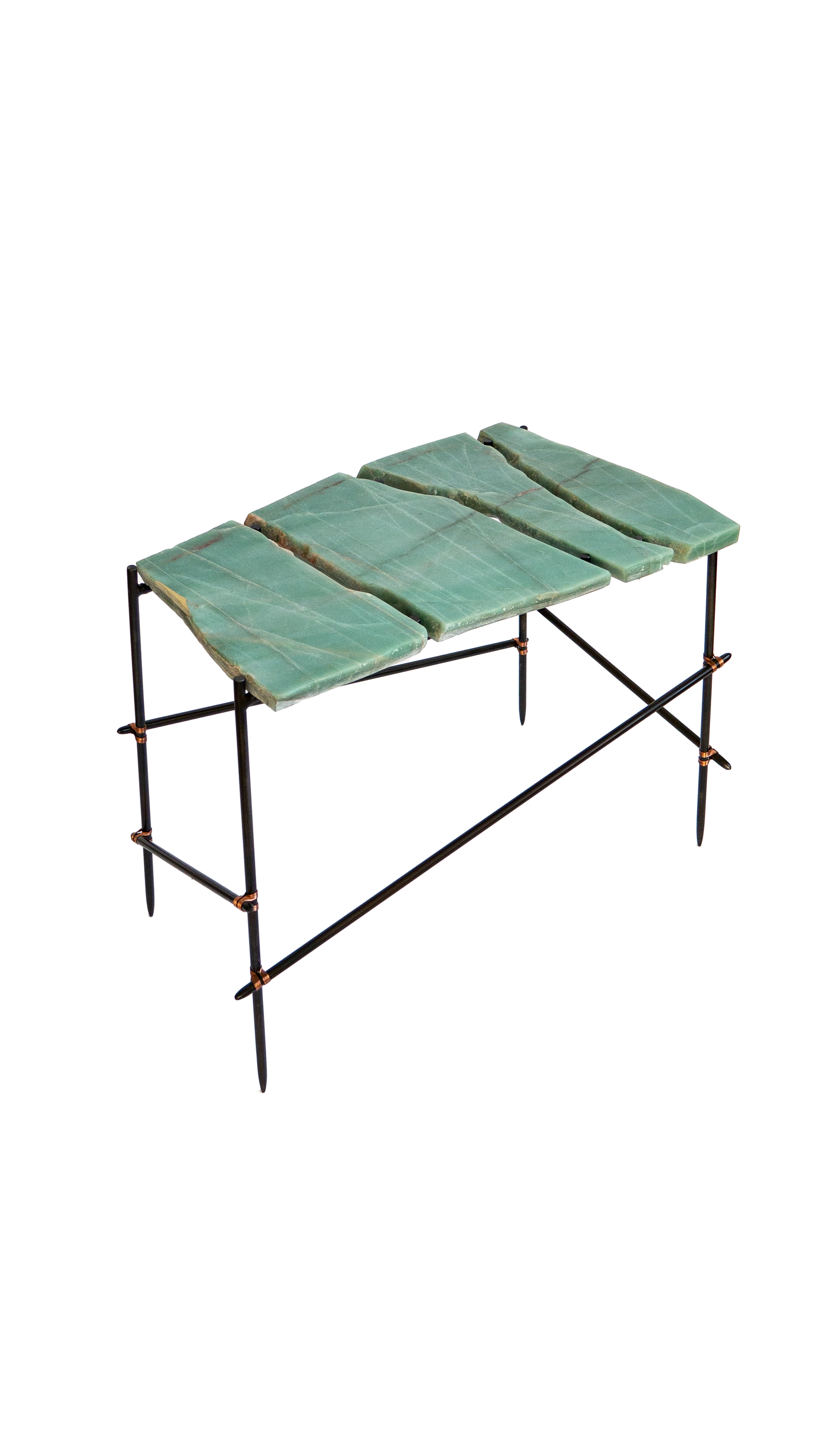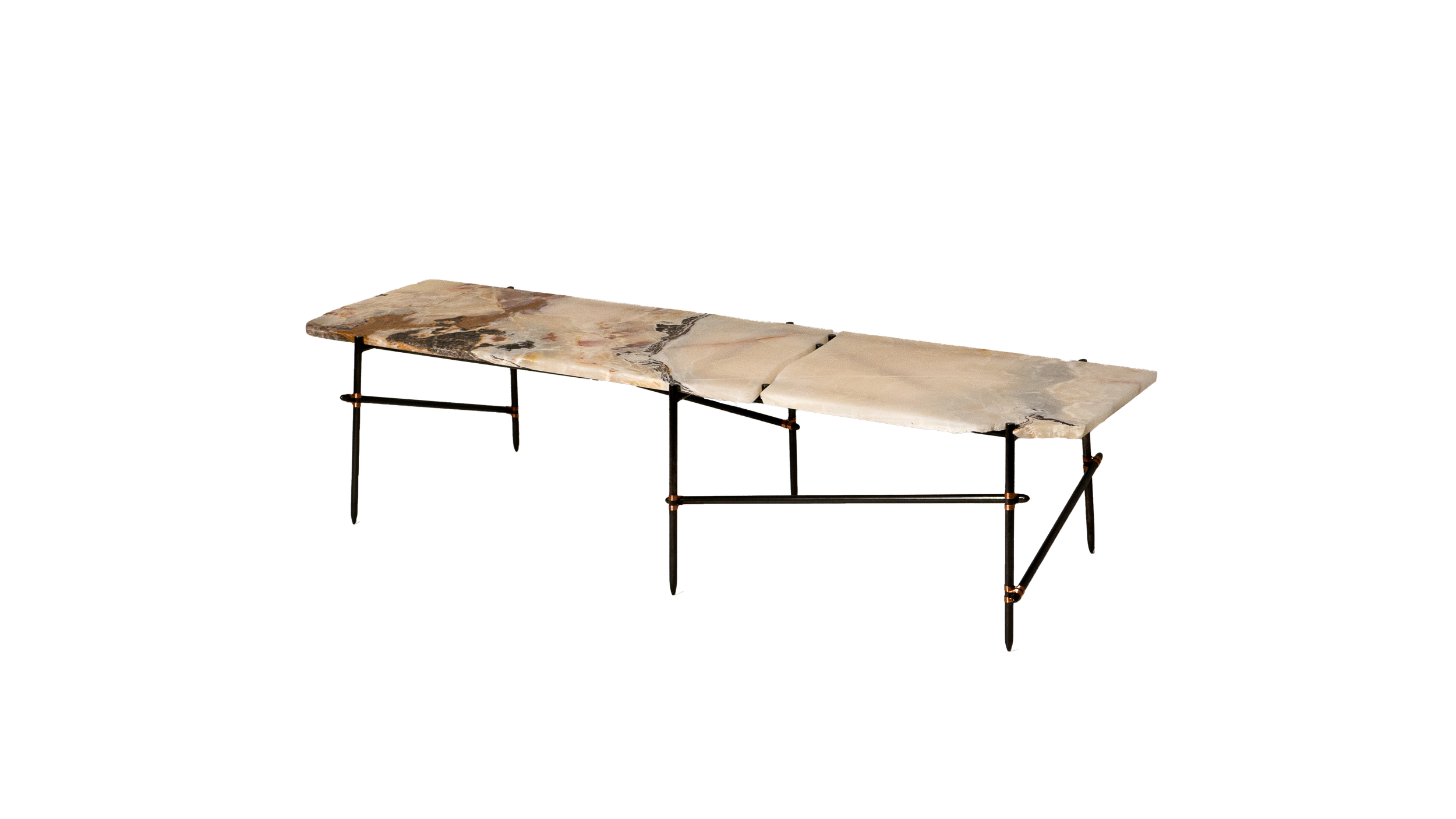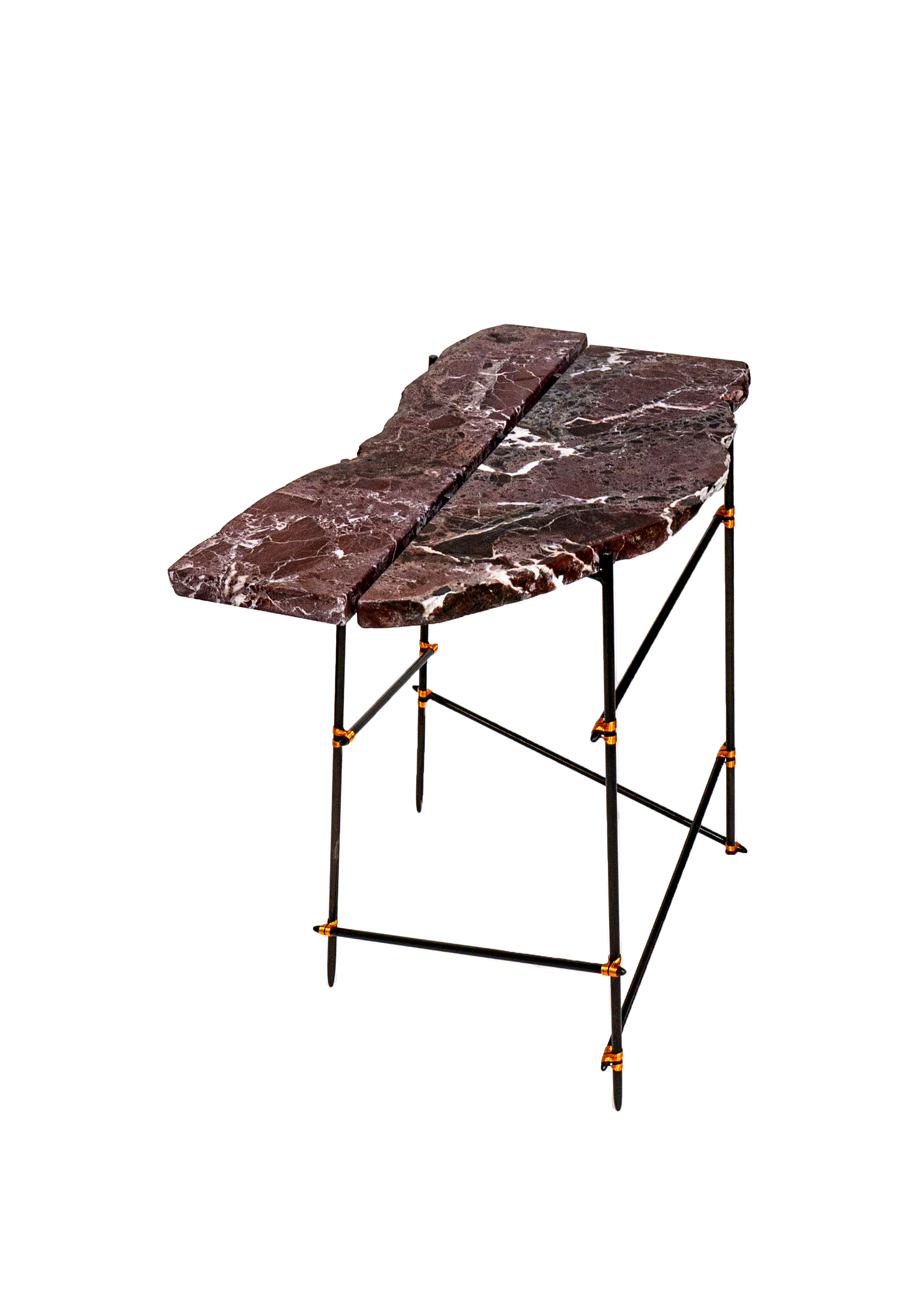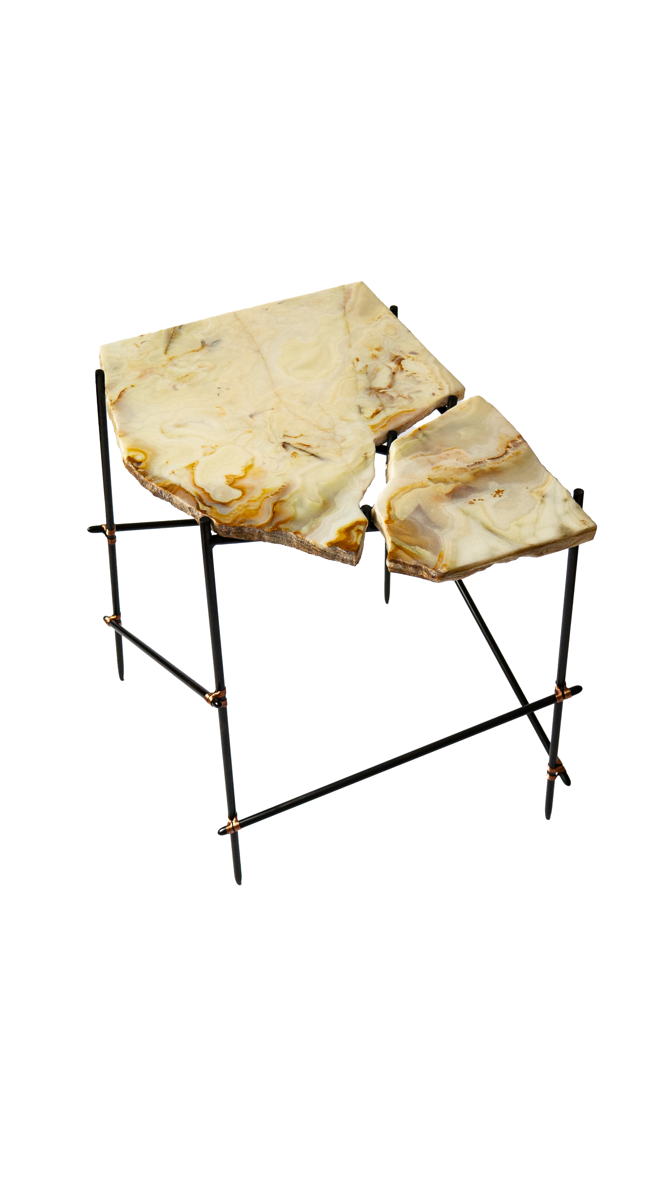 Each salvaged stone is paired with a hand-crafted steel frame specifically designed in response to its form — a quiet act of restoration. Stone surfaces are re-finished, while frames, reminiscent of ad-hoc scaffolding, are patinated, sealed, and bound with copper wire detailing, allowing imperfection to remain visible and repair to take centre stage.