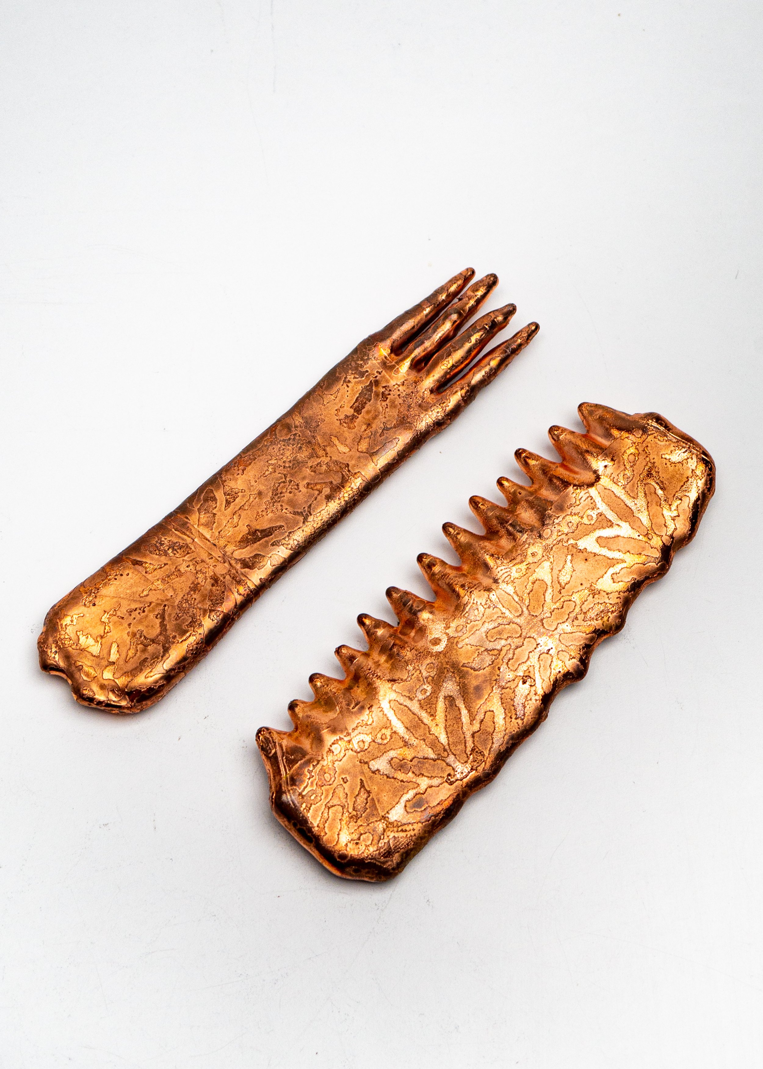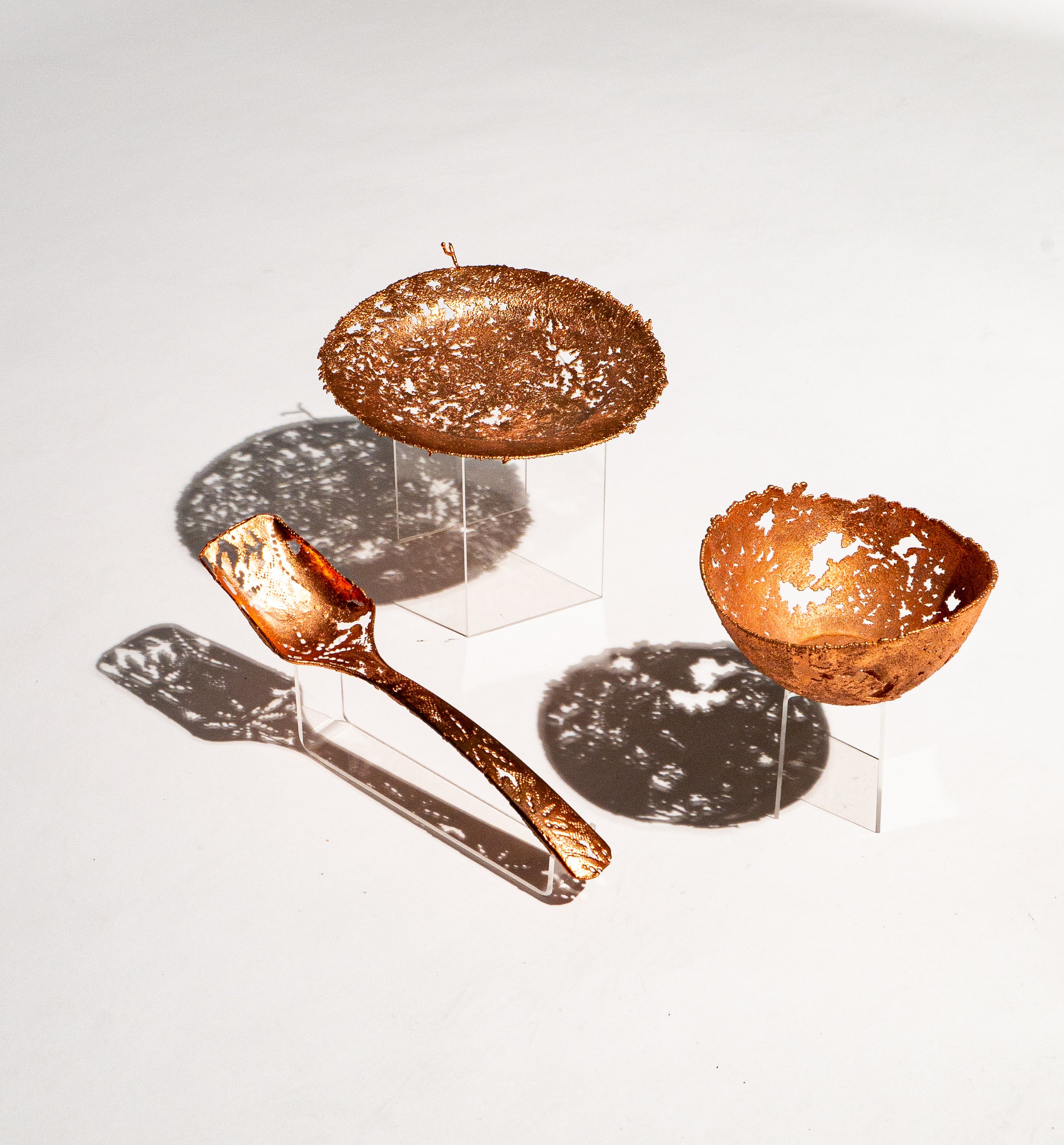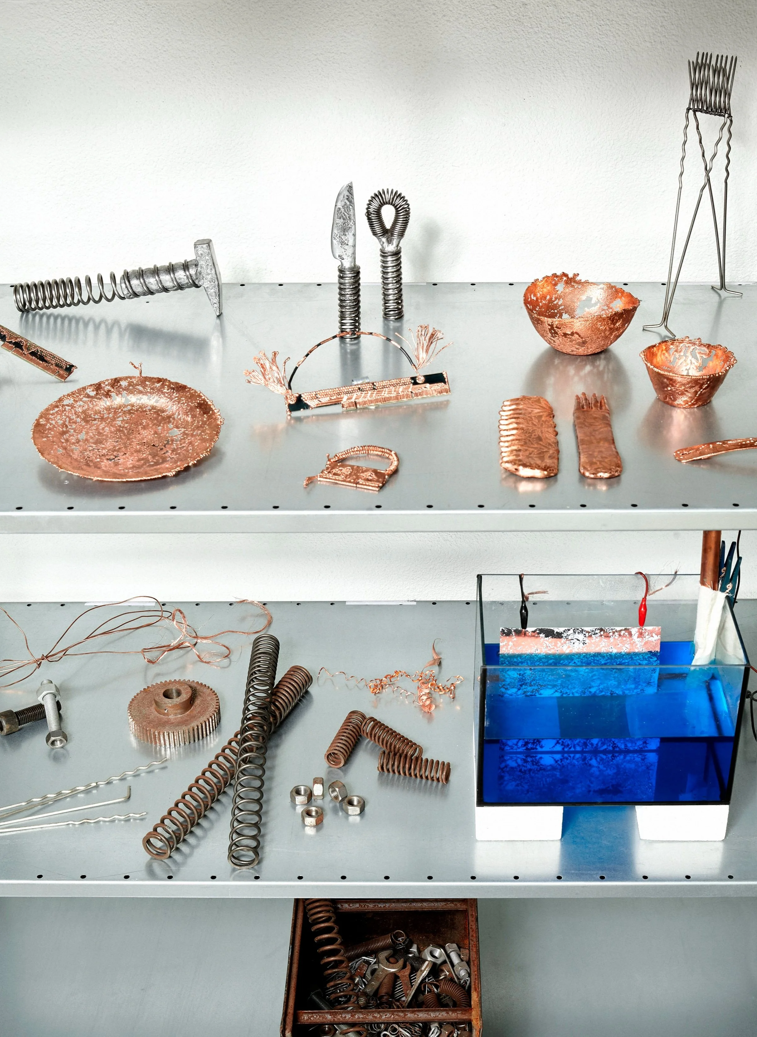 Scraptopia explores copper reclaimed from electrical waste through a process of material transformation. Using electroplating as a generative tool rather than a surface finish, copper is harvested molecule by molecule from scrap and grown over several days into new forms.