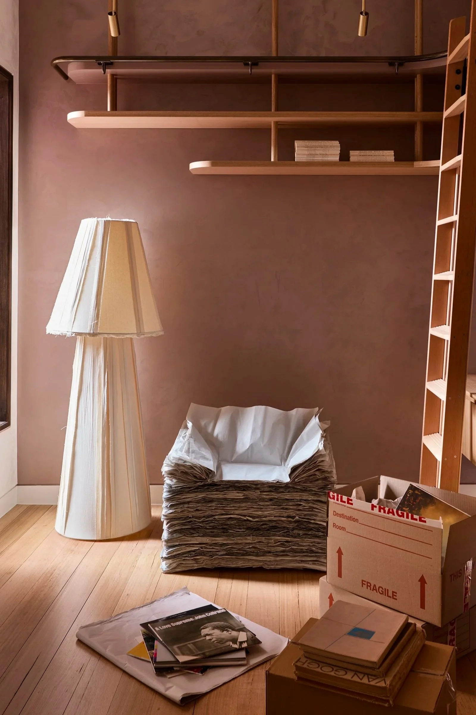 Toile is a series of oversized lamps shown as sculptural studies in calico, captured mid-process. Conceived as artist proofs, the works read like three-dimensional sketches - eccentric forms held in suspension, as if awaiting a final stitch. Appearing as table lamps, floor lamps, and one towering form, each piece leans quietly, its head adjusted by placement rather than symmetry, as if paused mid-conversation.